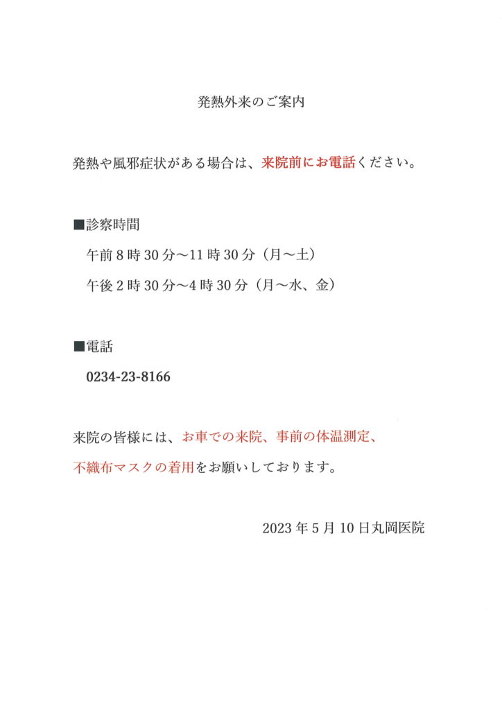 新着情報 公開日: 2025.03.26 発熱外来のご案内 ご予約・お問い合わせ医療法人丸岡医院 0234-23-8166 LINE予約Web予約 RESERVE / CONTACT 受診やご相談はこちらから 症状に応じた受診先のご案内、WEB予約、お電話でのご相談に対応しています。 0234-23-8166 WEB予約 お問い合わせ