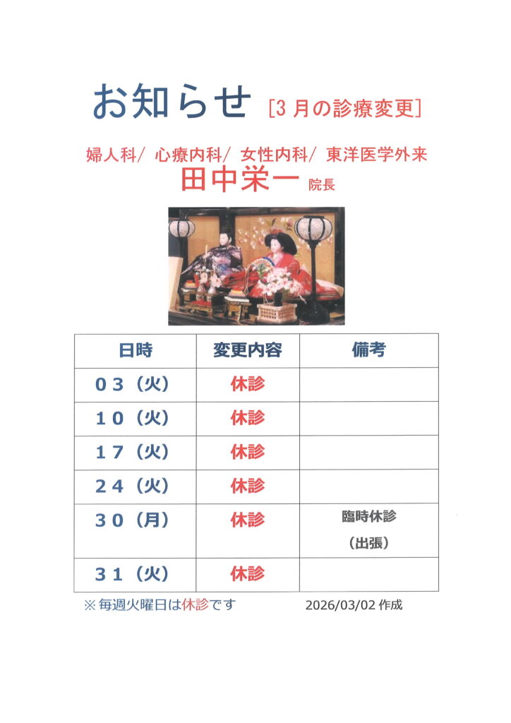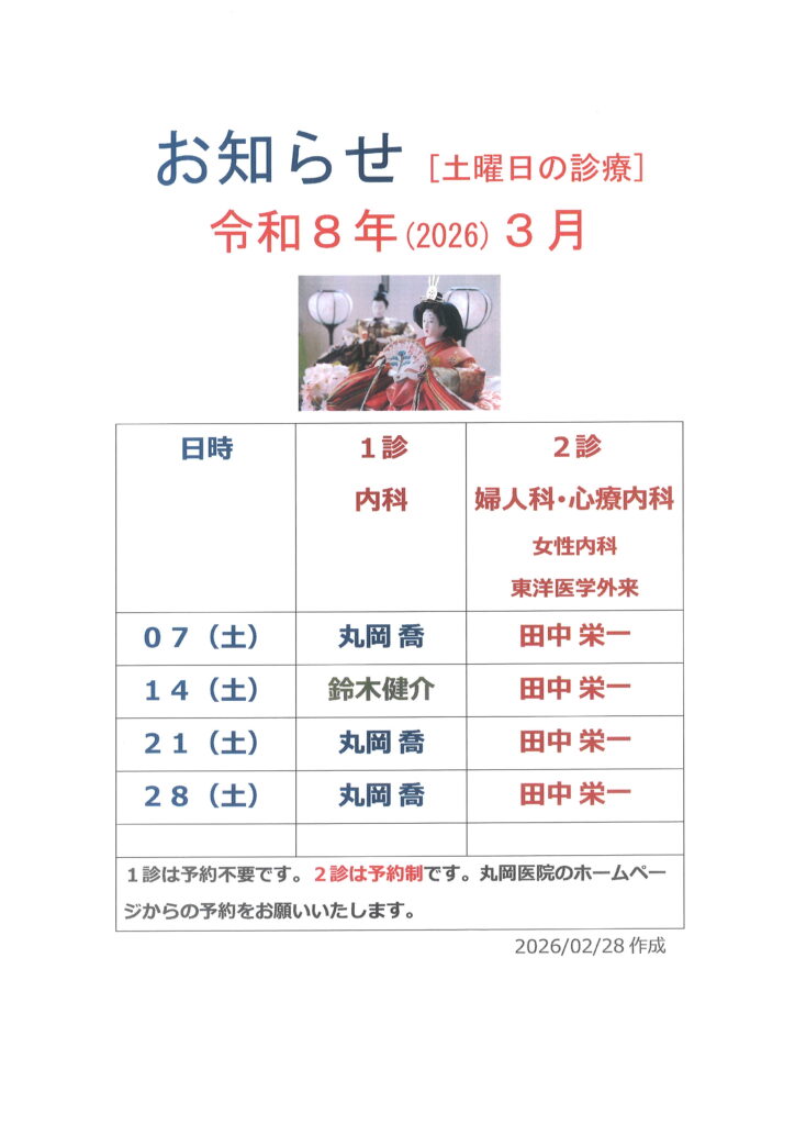 新着情報 公開日: 2026.03.03 3月の診療体制 ご予約・お問い合わせ医療法人丸岡医院 0234-23-8166 LINE予約Web予約 RESERVE / CONTACT 受診やご相談はこちらから 症状に応じた受診先のご案内、WEB予約、お電話でのご相談に対応しています。 0234-23-8166 WEB予約 お問い合わせ